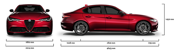 Димензиите на Alfa Romeo Giulia се: 4643 mm должина, 1450 mm висина и 2024 mm ширина, нуди перформанси и стил за уникатно и неспоредливо присуство на патот. Багажниот простор има максимален капацитет од 480 литри. Автомобилот е достапен со алуминиумски тркала од 18" и 19".